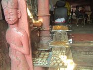 The entrance/exit to Agra fort is a bit out of the way so this time I took a cycle rickshaw for the trip around the walls and into the heart of old Agra. It was now way past lunch time but I spied a group of blokes standing around eating something interesting so I joined them. I think it was a type of chickpea curry with fried bread. At 30Rs for a large plate it was just the ticket!