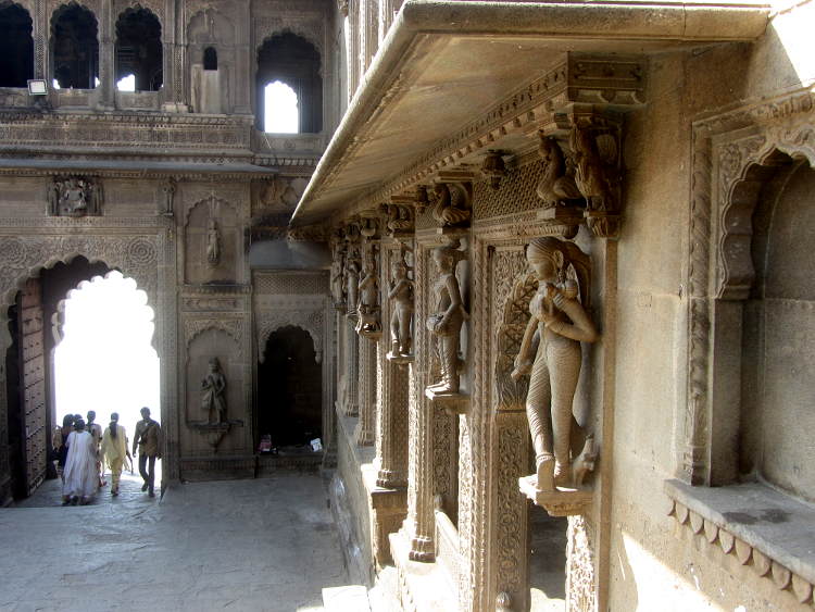 Most of the time I like to take local transport as it's usually fairly reliable and you get a much better experience of the land and the people. Also, the bus and train stations are a great opportunity to people watch. However, I had been told that the only way to get to Maheshwar from Mandu was to get a series of slow buses so I decided to splash out a bit (800Rs) and get a taxi for the fairly short hop. It was an uneventful hour and a half except for a puncture which gave me a few minutes to stretch my legs and admire a very dry and dusty view. I suppose it's not so surprising that the wet season is a more popular time of year for the locals to go on holiday here. On the way I did see quite a few people walking along the road which is quite rare. They weren't Indian backpackers but pilgrims. Maheshwar is mentioned in both the Mahabharata and the Ramayana, the two most famous books in Indian history and is a very popular pilgrimage site and I was to meet quite a few in my time here. However, I digress. Another advantage of getting a taxi is that I avoided a fairly long trek from the bus station to the river where most of the hotels are located. I stayed at the Aashay Hotel and paid 1250Rs for a nice big room with bathroom and my own open area outside which looked out over a school. I got there at lunchtime and all the kids were in the playground having lunch after which they all disappeared home.
