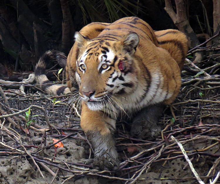At this stage a bit of explanation may be necessary. The Sundarbans is basically the largest mangrove forest in the world covering 10,000 square kilometres. Most of it is in Bangladesh and is where the giant rivers the Brahmaputra and Ganges meet the sea. However, I was at The Sundarbans National Park, 1000 square kilometres on the Indian side. This area a world heritage site, where the abundant wildlife is protected. Not least the famous Bengal tigers. Even so, people live on the boundaries and the tigers come and go as they please. Apparently over 1000 people have been killed by tigers in the last 40 years and I was told that someone had been killed fairly recently as he was collecting honey from wild bees in the mangroves. The advantage of being in a mangrove forest meant that we could see plenty of wildlife from the safety of a boat and this is where I was staying. Anyway, our first little trip was a mere taster and we saw plenty including snakes, monitor lizards and a couple of horseshoe crabs and we were still technically outside the park so it boded well for our main trip the following day.