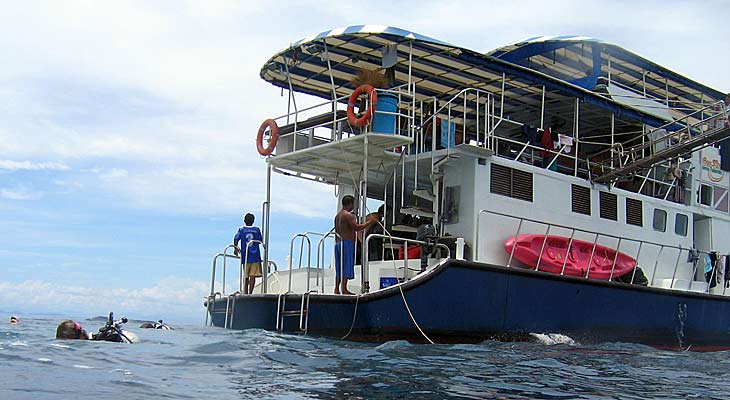 The Similan and Surin Islands are supposed to be one of the top dive spots in South East Asia if not the world, and we weren't disappointed. We had decided to visit them on a 5 day liveaboard with Seadragons, a dive company operating out of Khao Lac. Jackie had dived with them before. They are highly recommended as they are very professional, reasonably priced and as they operate out of Khao Lac rather than Phuket and so closer to the islands. They also run reasonably sized boats. On the trip we saw a boat out of Phuket which seemed to be cruise liner size with far too many divers aboard. As they also offer great discounts to returning divers we weren't surprised to learn that many of our companions for the week had been with Seadragon many times before. OK advert over, suffice it to say we were happy!
