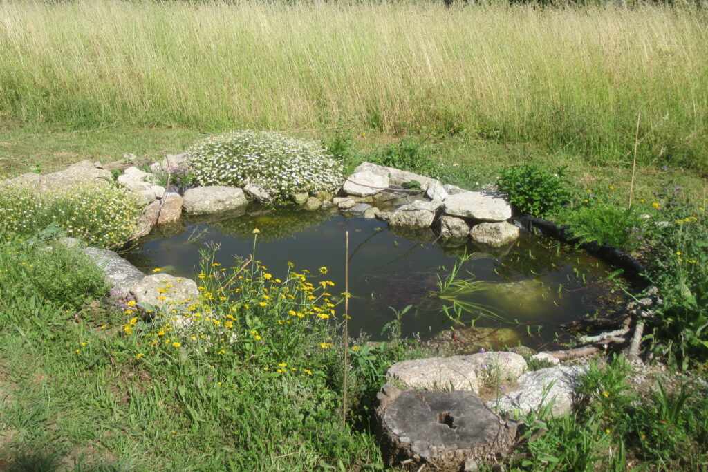Richard has built a bench from pallets and it’s from here I can spend some mindfulness moments. Slightly concerned about how green the water was looking we bought a number of waterlilies (which should come up next spring) and a solar powered heat pump.