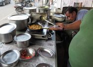 Like many Indian towns, animals are wandering freely in the streets but if you look up you can often spy some brightly coloured birds. There are often various kingfishers if there is water nearby and also plenty of birds of prey. I snapped this Black Shouldered Kite in the centre of town. As it was February, it was peak wedding season. I heard the procession before I saw it: The Raju band leading a bunch of ladies with water jugs on their heads. I met them later on delivering their presents at the bride's house. The last photo below is a food stall where I had a meal. Cauliflower curry I think. I could only get the chef's stomach in the photo as he was so big and the restaurant so small.